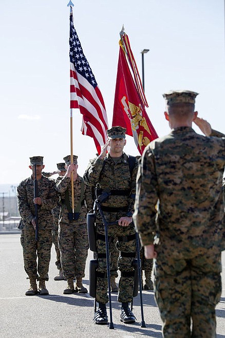 SAN DIEGO - A Marine who was left paralyzed by a sniper's bullet in Afghanistan fulfilled a promise to himself on Friday and walked using robotic leg braces in a ceremony at Camp Pendleton, where he was awarded a Bronze Star.