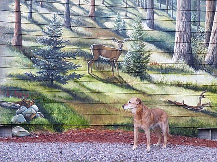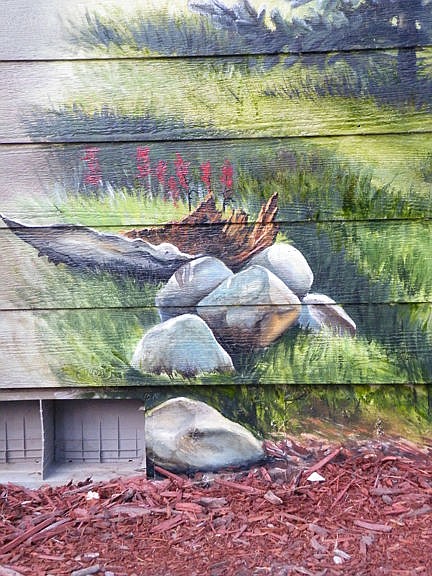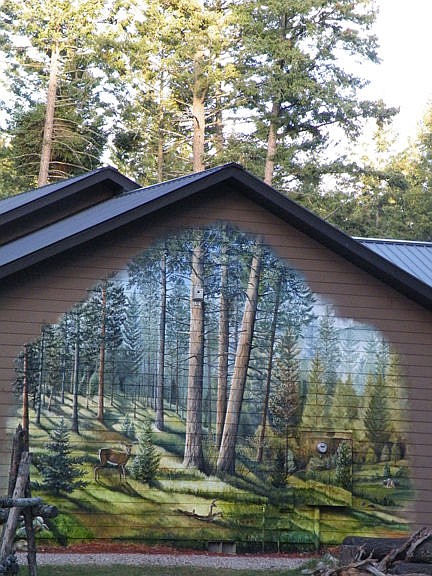Local artist Barbara Buchli’s been busy at Finley Point where she was commissioned to paint murals on the side of Dennis and Linda Hewitt’s house, which is located just before Finlely Point Road descends toward the State Park.