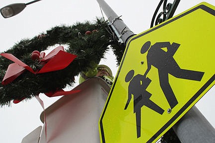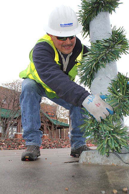 Mission Valley Power workers scanned the streets Tuesday to put up holiday wreaths on light poles.