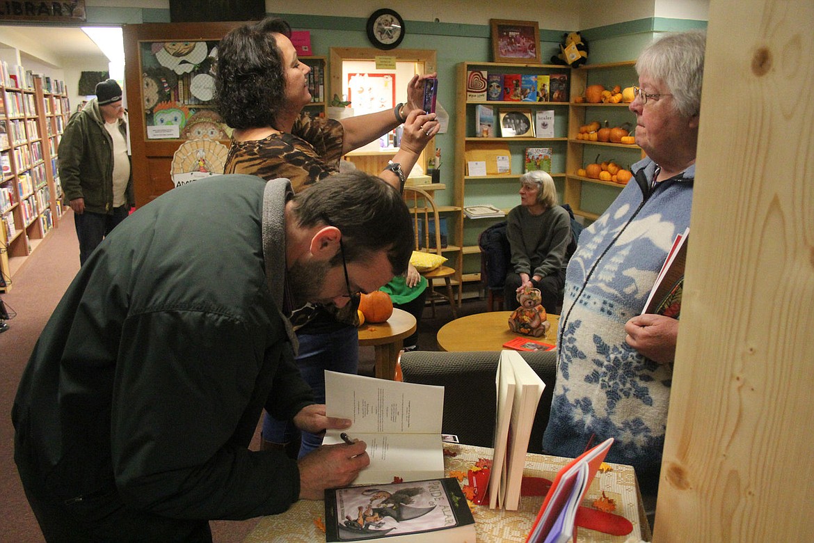 Nolan Webber signs his book for a fan during a book signing event in Superior last week. Webber's novel, "Pride of Alar," is the first in a planned series of three or possibly four novels.