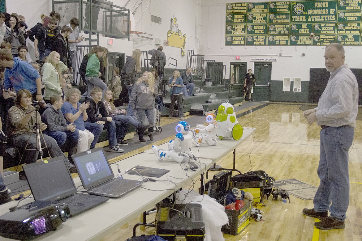 Hunter Lloyd, far right, performs his robotic comedy routine with a message for the St. Regis schools last week.