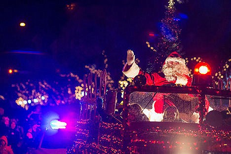 Dozens of entries moved along the parade route - the Community Network Bookmobile joyfully sounded its horn for the crowd, the Snake Pit Derby Dames' giant inflated green-and-black roller skate stood on a float above everyone and the Lake City and Coeur d'Alene high school bands sloshed down the street while performing holiday favorites.