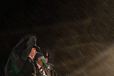 COEUR d'ALENE - Pouring rain, pelting sleet and frigid wind might have called for rain slickers and ponchos, but the weather couldn't drench the spirits of thousands who combated the elements Friday evening to enjoy the 28th annual Coeur d'Alene Resort Holiday Light Show opening ceremony.