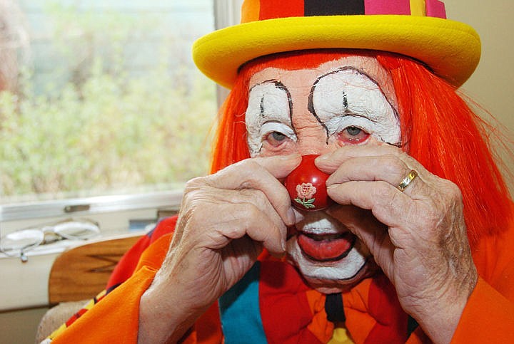 FILE - In this March 29, 2012, file photo, Floyd "Creeky" Creekmore puts on his nose while getting dressed before a visit with children at a circus in Billings, Mont. Creekmore, the world's oldest clown died Saturday night, Sept. 27, 2014, of complications from heart disease at his home in Billings, Mont., his son Dave Creekmore said. He was 98. (AP Photo/Matthew Brown, File)