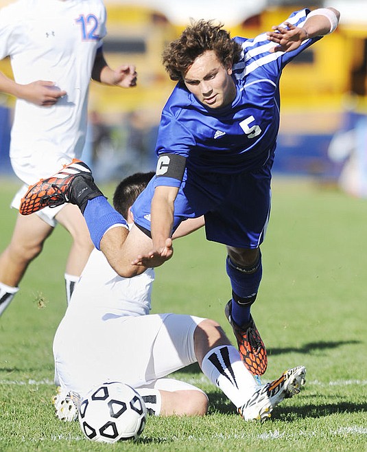 Bigfork's Kyle Thompson is trips as he drives toward the goal during the first half in the Vikings' 4-2 win against the Wildcats in Columbia Falls. (Aaric Bryan/Daily Inter Lake)