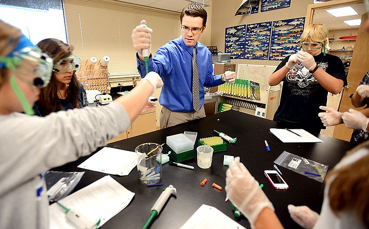 Glacier High School science teacher Austin Robbins helps students with their DNA extraction lab on Tuesday.