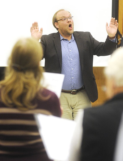 Glacier Chorale Conducter Micah Hunter leads the chorale during a practice at Flathead High School on Thursday. (Aaric Bryan/Daily Inter Lake)