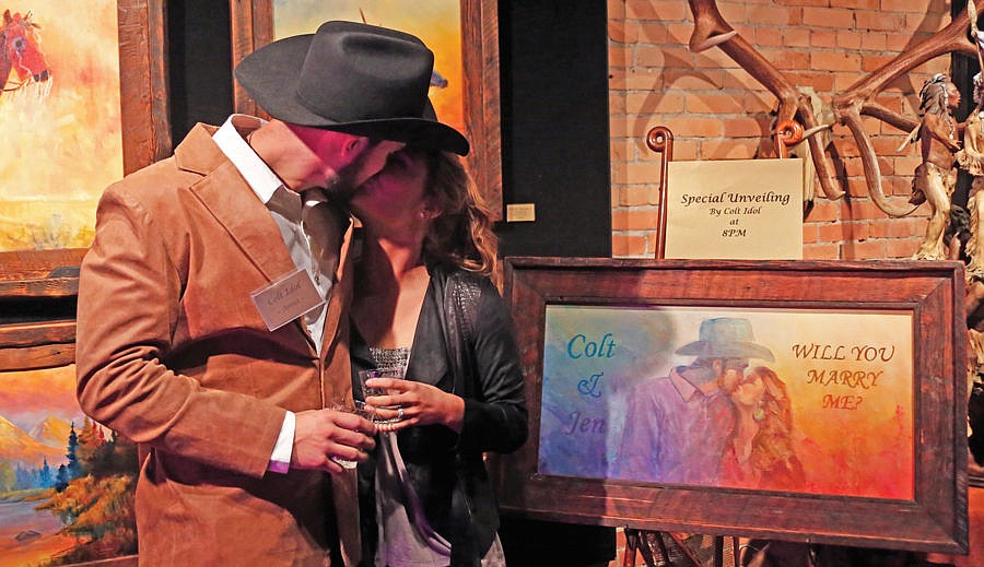 Colt Idol kisses Jennifer Brus after proposing to her during a portait unveiling Thursday night in Whitefish. Idol surprised Brus with a portrait he painted of the two of them. “She came to so many art events with me over the last year,” Idol said. “She’s always been supportive of what I do.”