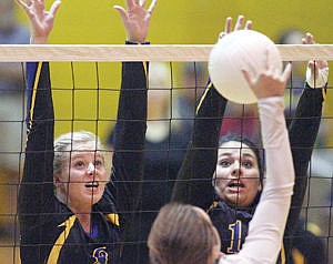 Hailley Moe, left and Staci Regh preparing to block vs. Whitefish Sept. 13.