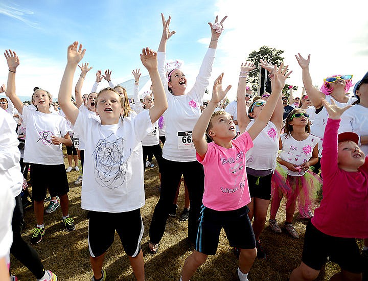 Runners gather for warm ups and giveaways prior to the start of the Pink Me Up run on Sunday, October 5, in Kalispell.