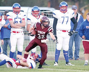 Junior Cody Johnson charges down field after intercepting a Bigfork pass in the first quarter Friday night.