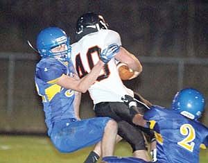 Erik Lauer, left, and Logan Nelson go high and low tackling Frenchtown's Cole Allen in fourth quarter.