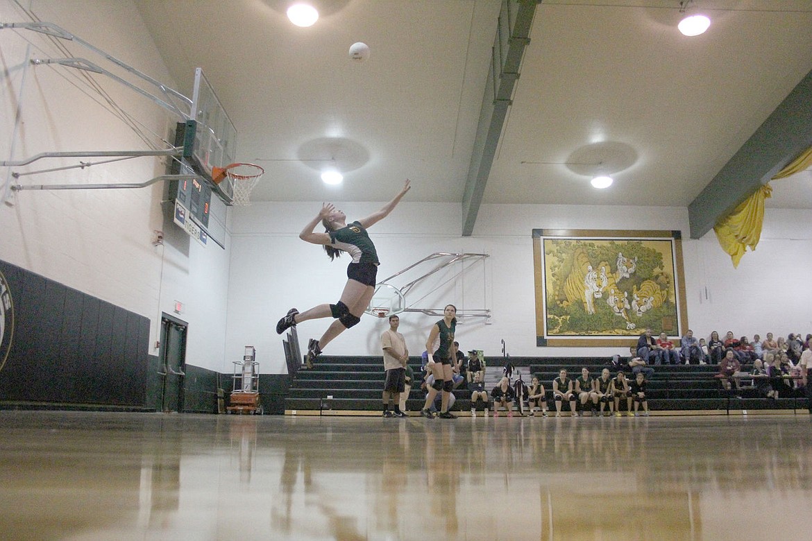 Gabby Moeller flies through the air before serving the ball against Hot Springs last week.