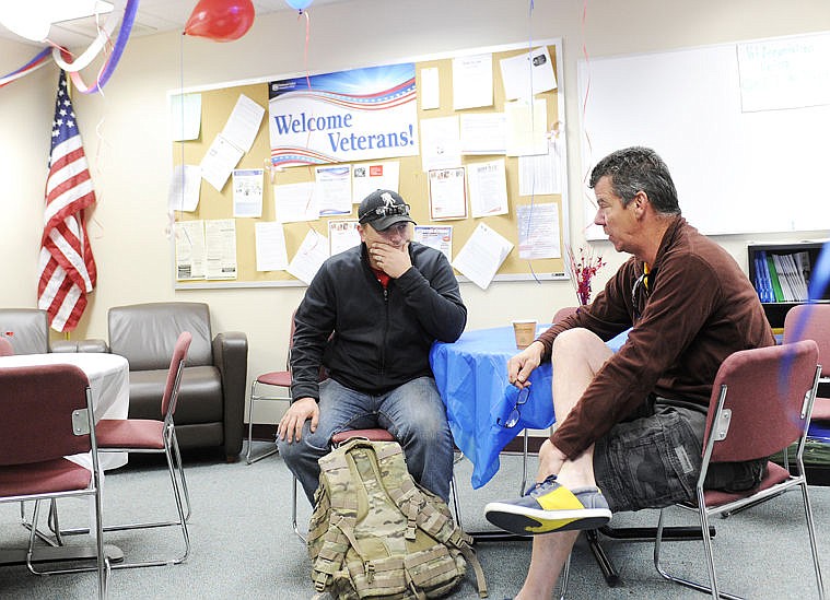 U.S. Army veteran William Reed, left, talks with Michael Taylor in the Flathead Valley Community College Veterans' Center on Wednesday. Reed, who is studying civil engineering, said the center is a great place to come and relax and interact with other veterans. (Aaric Bryan/Daily Inter Lake)