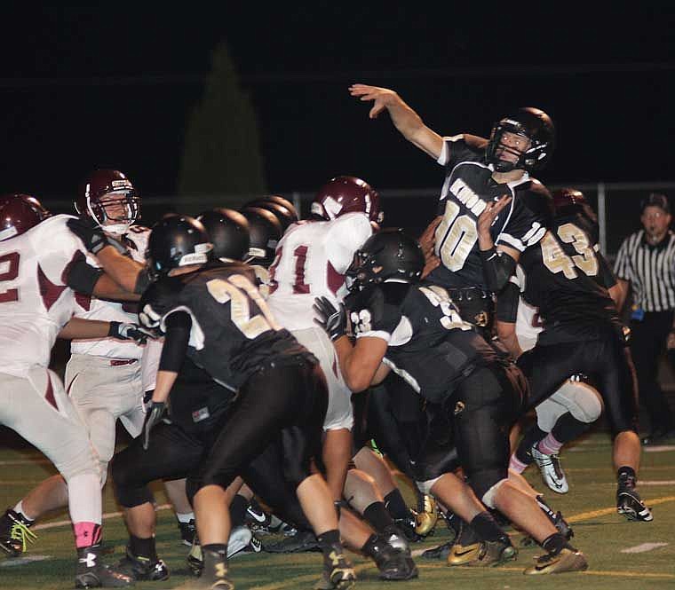 Royal quarterback Kaden Jenks scanned to his left and threw a dart to leading receiver Jose Ponce for a 21-yard gain that took the ball to the Wahluke 25.