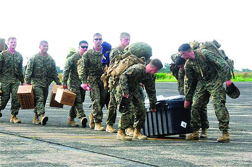 As vehicles unloaded boxes of equipment wrapped in green-and-black cloth, the Marines formed a line on the tarmac and had their temperatures checked by Liberian health workers.