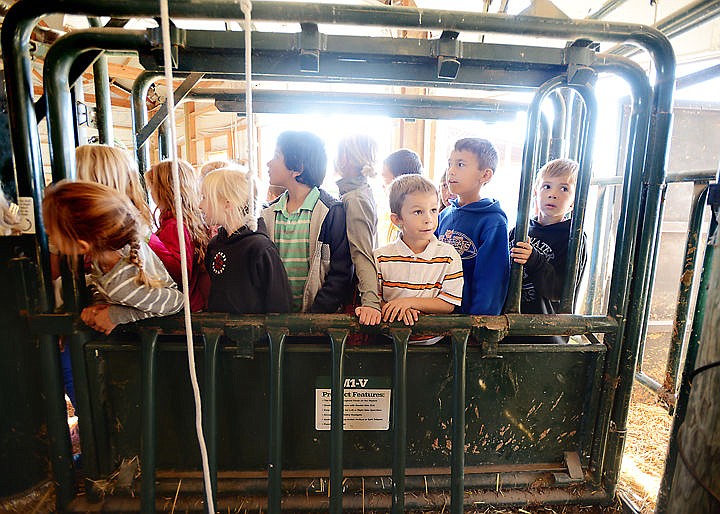 A group of elementary school students from Peterson are weighed in at 800 pounds on Friday, October 10 at the annual Heritage Days at the H. E. Robinson Agricultural Education Center in Kalispell. Students went through the chutes, as they learned about vaccinations and then continued on to a branding station. (Brenda Ahearn/Daily Inter Lake)