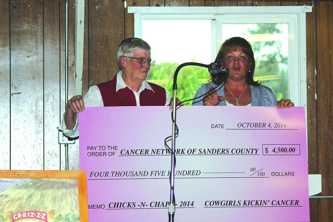 Rae Herman (right) presents a check Cowgirls Kickin' Cancer to Kathy Miller and the Cancer Network of Sanders County during last weekend's annual gala.