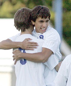 Walter Briones, right, gets a celebratory hug from Cody Wood after scoring with 34:50 remaining on the first half clock vs. Bigfork.