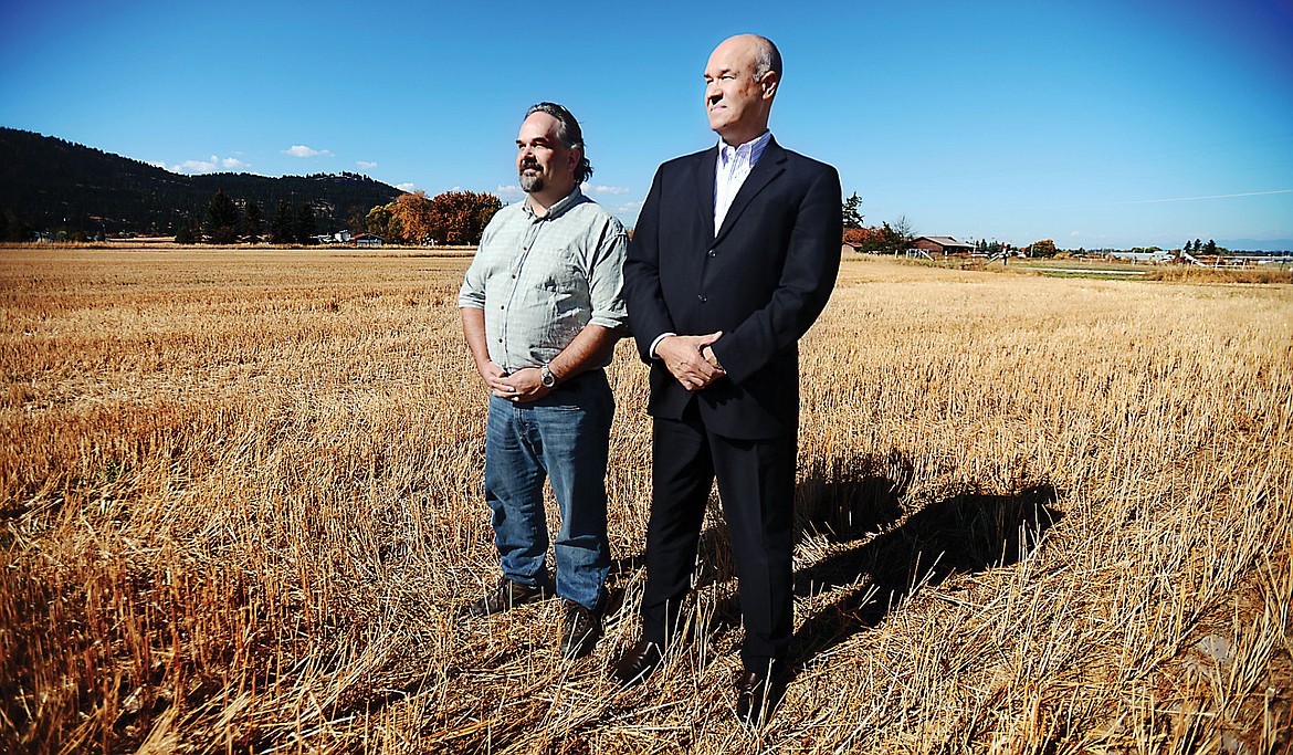 Kalispell Public Schools School District 5 Superintendent Mark Flatau and Trustee Jeremy Reed stand in a field that is part of a Land Acquisition Proposition on Friday, October 10, south of town on Airport Road. The land, if purchased, is to be used as a elementary district school site. (Brenda Ahearn/Daily Inter Lake)