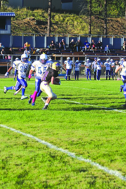 Junior linebacker Kyle Milner (#55) and senior defensive back Ty Carter (#32) of Thompson Falls track down an opposing player from Cutbank earlier in the year. The Bluehawks fell to Ronan 31-26 last weekend.
