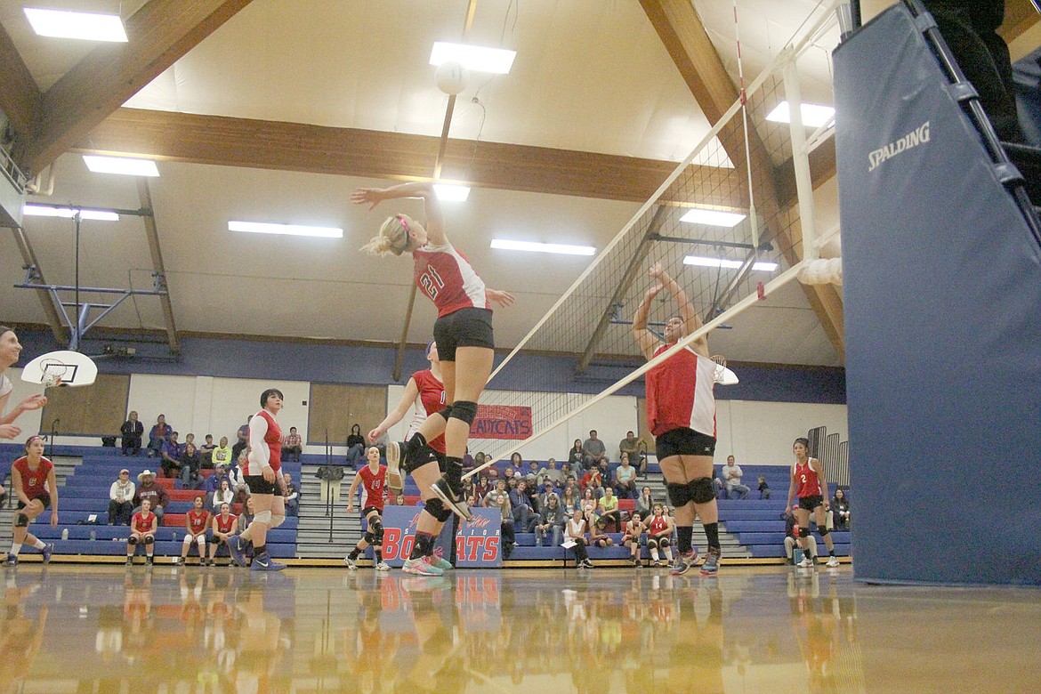 Jordan Mueller goes up high for the Lady Bobcats against Two Eagle River last week during homecoming in Superior.