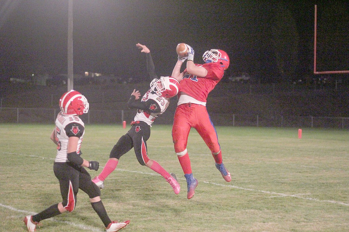 Josh Benda goes up high to pull down a pass from Michael Perkins during the Bobcats' firs win of the season against Noxon.