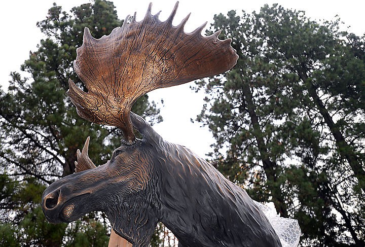 A view of The Bull of the Woods by Canadian artist Karl Lansing of British Columbia, as it stands on a flatbed truck as is made ready for the drive across country to Lake Placid, New York. (Brenda Ahearn/Daily Inter Lake)