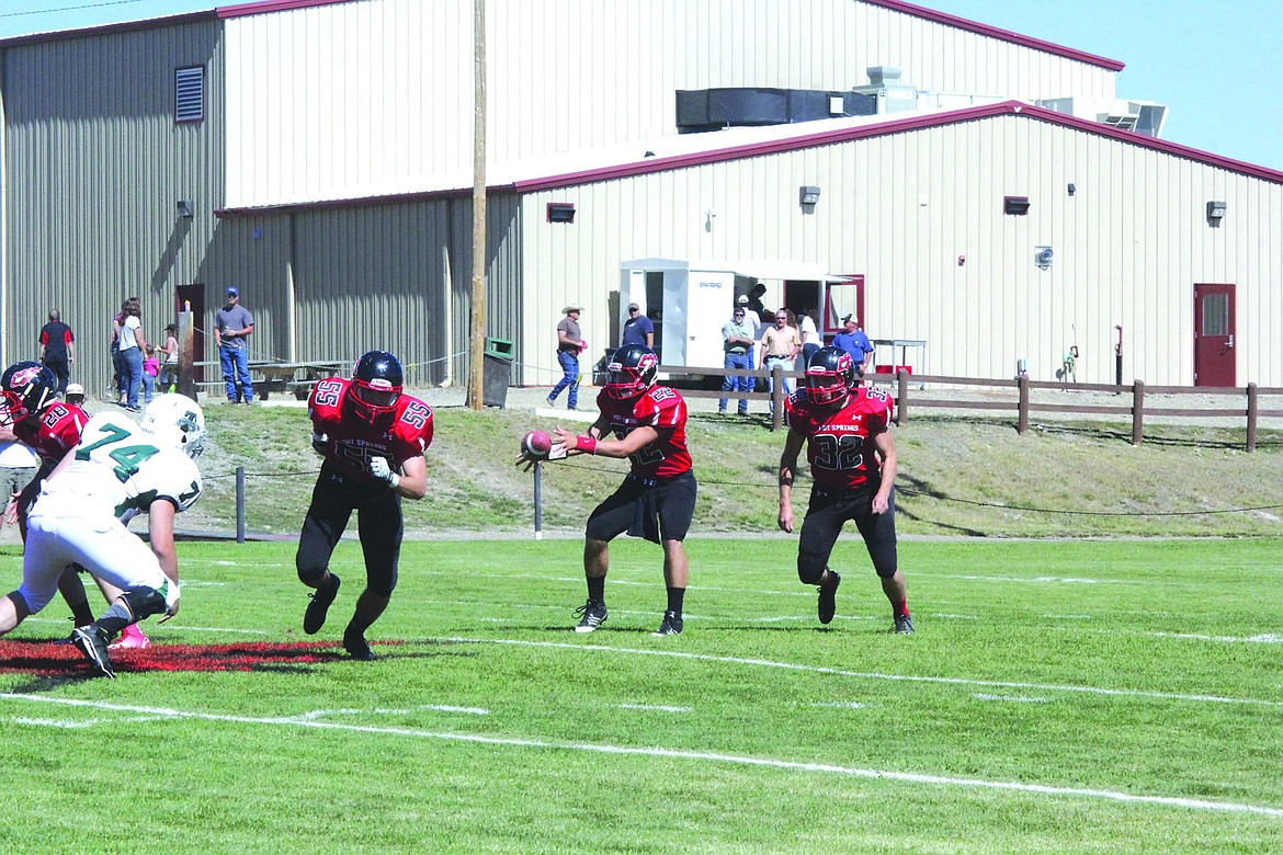 Senior quarterback Tanner Hoff receives the snap during an early season game against Tri-City. Hot Springs defeated Big Sandy 50-0 last weekend.
