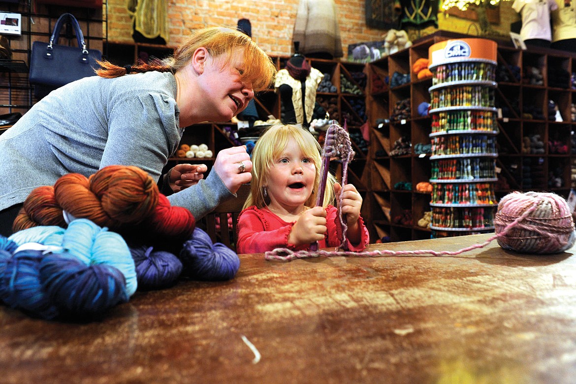Meche Ek helps her 5-year-old daughter, Sidney, knit at Camas Creek Yarn on Tuesday.