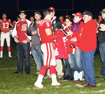 At halftime, Bob, Jeannie, Sean and Dana Lyon, along with a host of former teammates, had every No. 64 jersey in Sandpoint handed to them at half by current players at all levels. The two jerseys that David Lyon wore as an all-state offensive and defensive lineman in 2002 were also presented to the family. Sandpoint junior Carlos Collado wore the No. 64 jersey, with Lyon’s name on the back, in the first half, before taking it off and presenting it to the family at half.