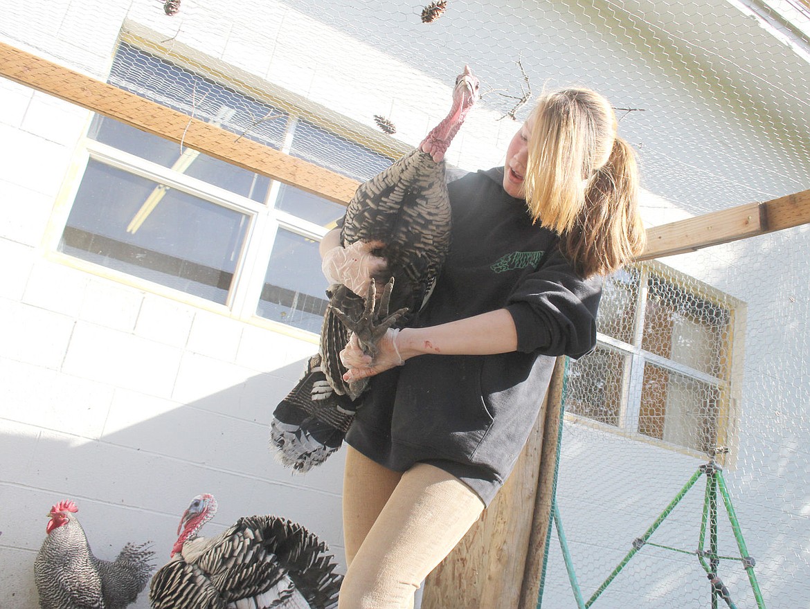 Zianna King of St. Regis carries a turkey out of the pen at the high school on the way to processing last week as part of a lesson about homegrown food.
