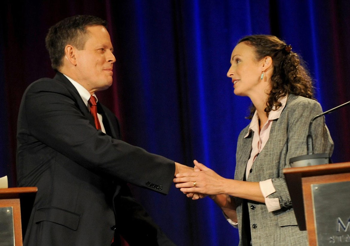 U.S. Rep. Steve Daines and Montana State Rep. Amanda Curtis shake hands after a political debate Monday in Billings. (AP Photo/The Billings Gazette, Hannah Potes)