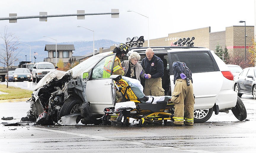Emergency workers help the driver and lone occupant of a minivan involved in a two-vehicle accident onto a gurney to be transported to Kalispell Regional Medical Center on Tuesday afternoon. The Toyota Sienna was headed north on U.S. 93 and attempting a left turn on Reserve Loop when it was struck by a Hummer pulling a trailer heading south on U.S. 93. The driver of the Hummer declined medical attention. The accident is still under investigation; no citations have been issued.