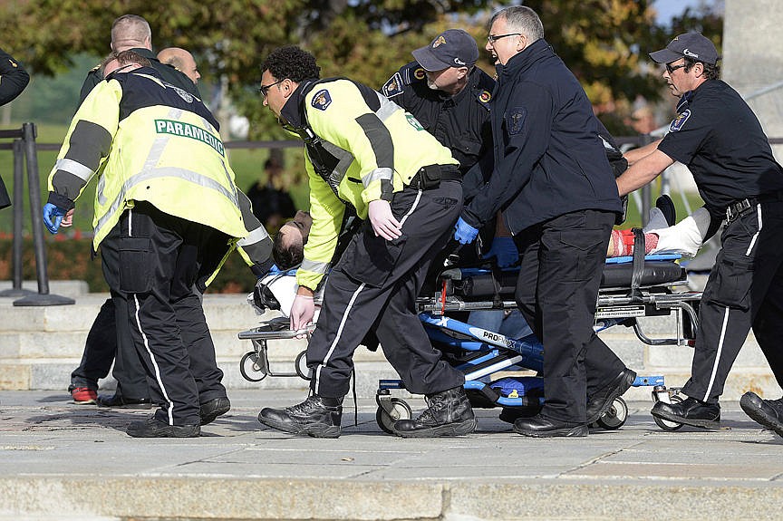 Paramedics and police pull a victim away from the Canadian War Memorial in Ottawa, Ontario, on Wednesday, Oct. 22, 2014. A soldier standing guard at the National War Memorial was shot by an unknown gunman and people reported hearing gunfire inside the halls of Parliament. Prime Minister Stephen Harper was rushed away from Parliament Hill to an undisclosed location, according to officials. (AP Photo/The Canadian Press, Adrian Wyld)