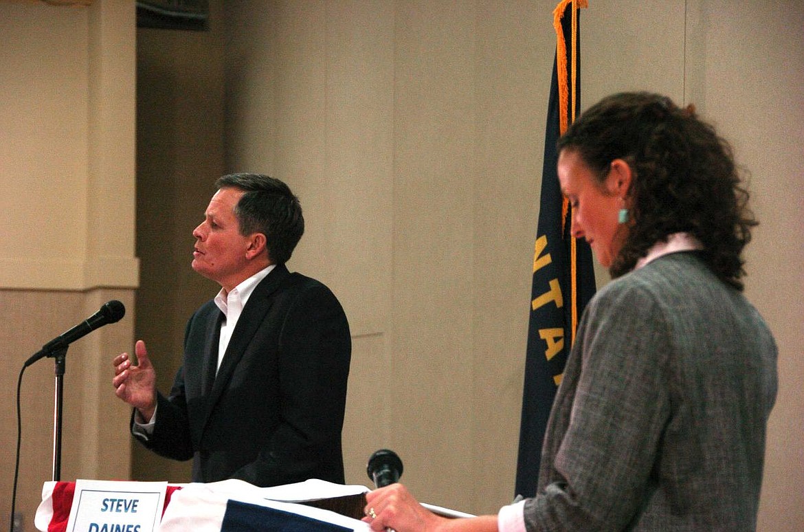Republican Steve Daines responds to a question as Democrat Amanda Curtis waits her turn to speak during a Tuesday, Oct. 21, 2014, debate in Sidney for the state's open U.S. Senate seat. (AP Photo)