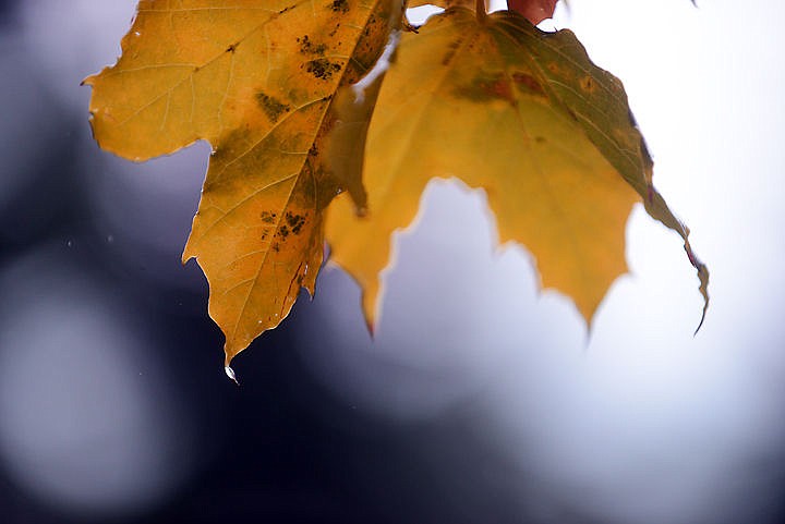 A drop of rain clings to the tip of maple leaf as a soft rain falls on Thursday, October 23, in Columbia Falls. The rain is expected to hasten the end of the fall color. (Brenda Ahearn/Daily Inter Lake)