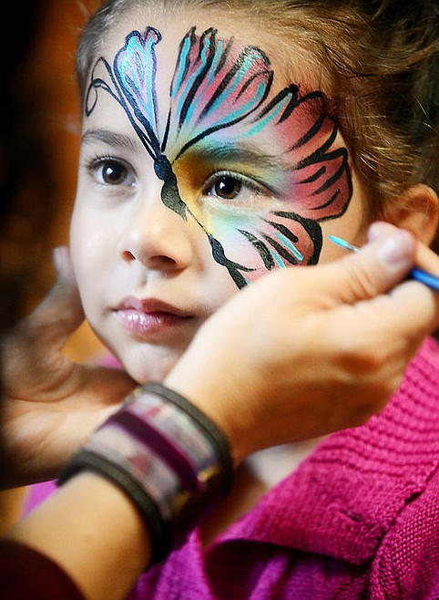 Kathleen Francis draws a butterfly on the face of Grace DiMeo, 4, on Tuesday, October 21, in Kalispell. (Brenda Ahearn/Daily Inter Lake)