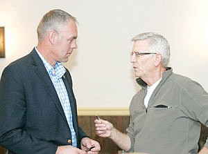 Congressional candidate Ryan Zinke speaks with Mick Shea during a meet and greet at the Venture Motor Inn Monday morning.