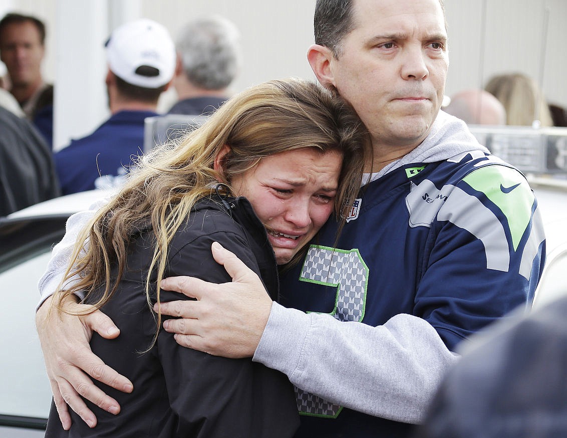 People react as they wait at a church, Friday, Oct. 24, 2014, where students were taken to be reunited with parents following a shooting at Marysville Pilchuck High School in Marysville, Wash. (AP Photo/Ted S. Warren)