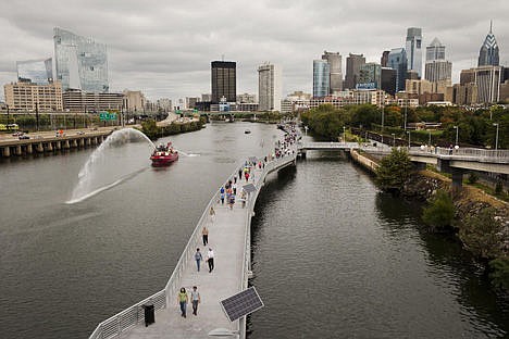 The winding, gray concrete pathway gives visitors the unique sensation of having water on both sides of them, Joseph Syrnick, president and CEO of the Schuylkill River Development Corp., said Sept. 30 as he walked the 15-foot-wide boardwalk prior to its opening.