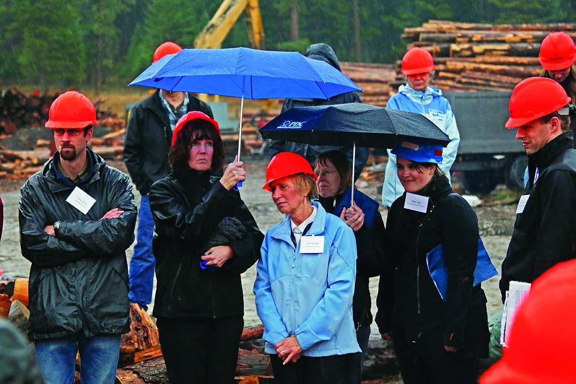 Jane Wright, center, of Flathead Job Services, takes cover from a downpour under an umbrella with coworkers during a speech on niche markets for forest products at Wild Montana Wood, the last stop on the tour. (Brianna Loper/Daily Inter Lake)