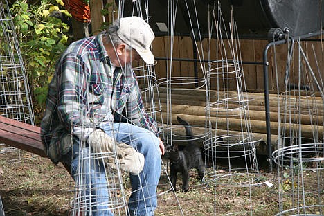 Jim Turner of Coeur d'Alene busied himself straightening the wires of plant supports so they could be used next season. He delicately unwound dead weeds that had wrapped around the wires. He also had a visit from a spritely young feline who romped around the garden, making children laugh and fear for their lives at the same time as it ran at them, flipped around and ran away.
