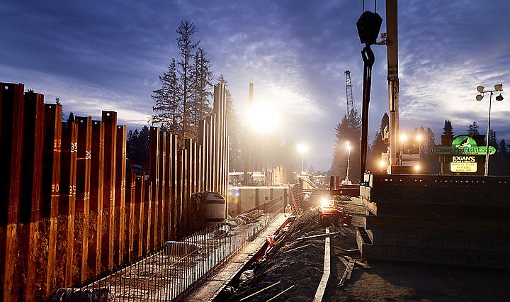 A sheet pile, made of individual sheets of steel sunk 30 feet into the ground, left, acts as a temporary retaining wall for construction workers to build the permanent retaining walls while traffic is driving on US 93. (Brenda Ahearn/Daily Inter Lake)