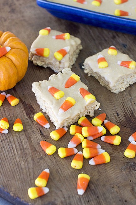 The treats were great and made me think of fall, of caramel apples and Halloween. And so I decided to take my improved treats even further, adding a caramel bourbon glaze. Because who says all Halloween treats have to be for the kids? And then I just kept going... Next I added a sprinkle of coarse sea salt to the caramel topping and candy corns. I was in love.