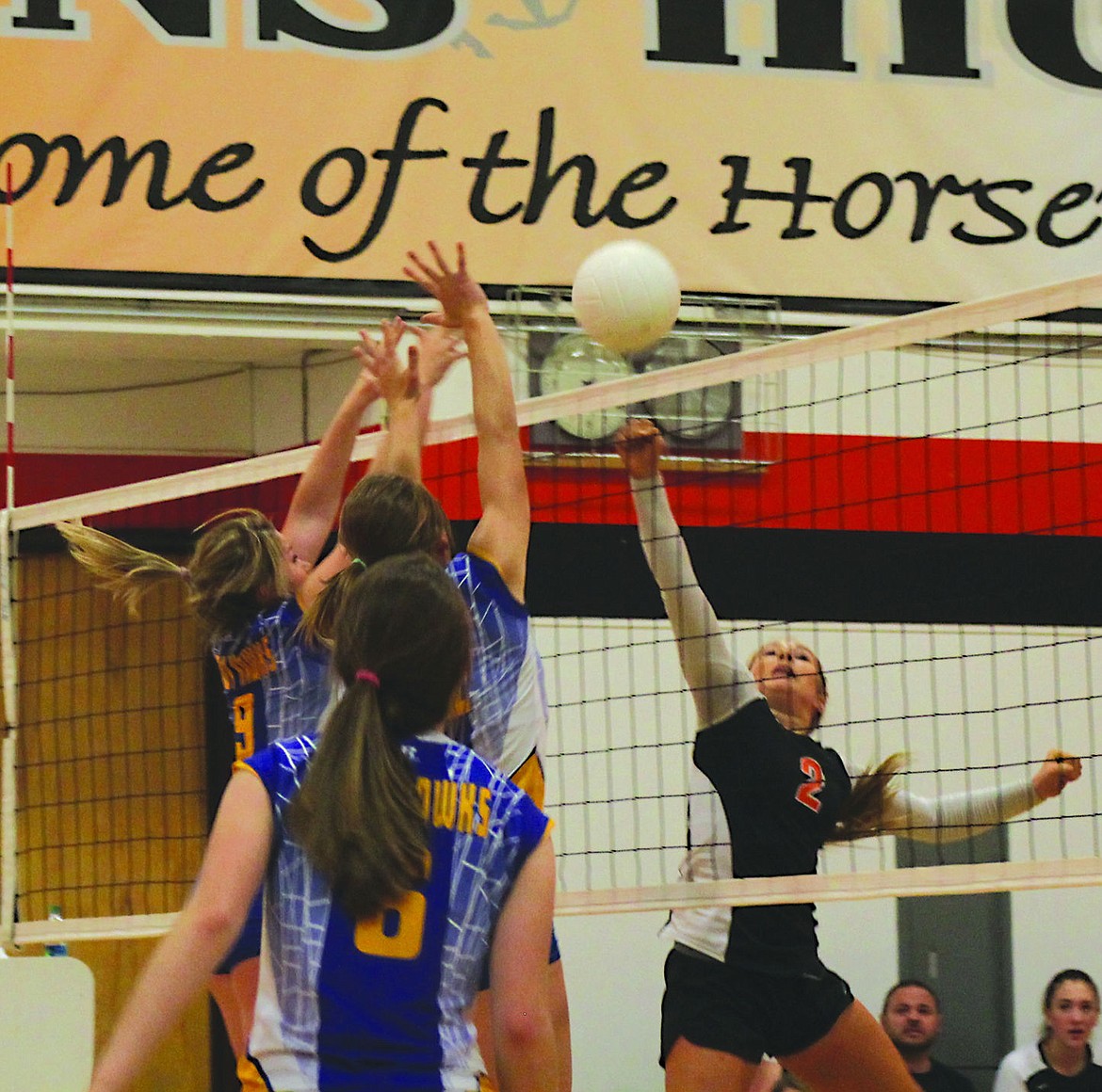 Senior Rebekah Barnard hits the volleyball past the Thompson Falls defense in a match earlier in the season.