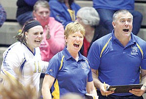 Dayln Germany, left, Coach Cindy Ostrem-Johnston and Coach Tom Gallagher react to the Lady Loggers' sweep of Frenchtown in three Saturday: 26-24, 25-17, 25-13.