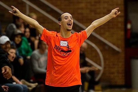 The teams were introduced by a booming voice over the loudspeakers. The lights were dimmed, the fog machine and dazzling lights generated an all-star atmosphere and cheering fans formed a line to high-five their favorite players as they ran past them to the center of the court. The crowd roared as the individuals players' names were announced, and the roaring was exceptionally loud as Anthony "A-Train" Eastman King of Post Falls performed a stylish cartwheel.