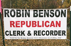 Signs promoting Robin Benson, a candidate for Lincoln County clerk and recorder, violate a Montana election law regarding the use of political party names in campaign materials according to an attorney with the Secretary of State’s Office.