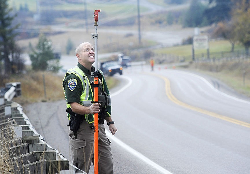 Montana Highway Patrol Trooper Rick Mehring collects data Friday on U.S. 93 at the scene of a three-vehicle accident in which two drivers died.